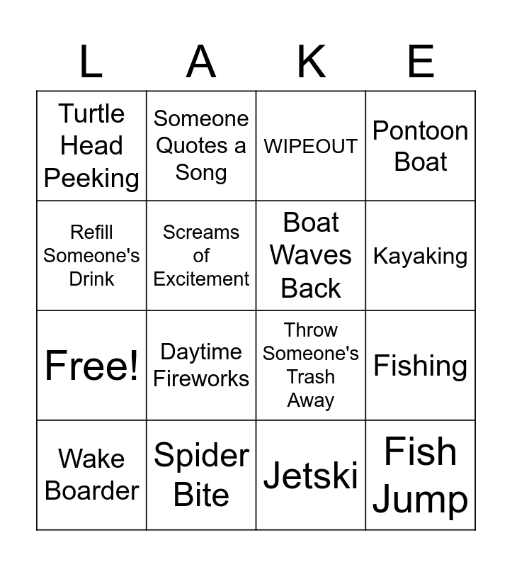 This bingo card has 20 words: Fishing, Mosquito Bite, WIPEOUT, Duck Fight, Wake Boarder, Refill Someone's Drink, Spider Bite, Turtle Head Peeking, Free!, Someone Quotes a Song, Daytime Fireworks, Throw Someone's Trash Away, Screams of Excitement, Fish Jump, Boat Waves Back, Cannonball, Kayaking, Pontoon Boat, Jetski and Wearing a Life Vest.