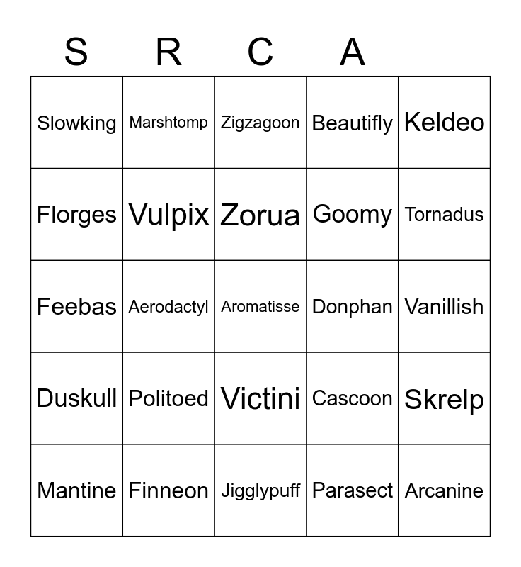 This bingo card has 719 words: Bulbasaur, Ivysaur, Venusaur, Charmander, Charmeleon, Charizard, Squirtle, Wartortle, Blastoise, Caterpie, Metapod, Butterfree, Weedle, Kakuna, Beedrill, Pidgey, Pidgeotto, Pidgeot, Rattata, Raticate, Spearow, Fearow, Ekans, Arbok, Pikachu, Raichu, Sandshrew, Sandslash, Nidoran♀, Nidorina, Nidoqueen, Nidoran♂, Nidorino, Nidoking, Clefairy, Clefable, Vulpix, Ninetales, Jigglypuff, Wigglytuff, Zubat, Golbat, Oddish, Gloom, Vileplume, Paras, Parasect, Venonat, Venomoth, Diglett, Dugtrio, Meowth, Persian, Psyduck, Golduck, Mankey, Primeape, Growlithe, Arcanine, Poliwag, Poliwhirl, Poliwrath, Abra, Kadabra, Alakazam, Machop, Machoke, Machamp, Bellsprout, Weepinbell, Victreebel, Tentacool, Tentacruel, Geodude, Graveler, Golem, Ponyta, Rapidash, Slowpoke, Slowbro, Magnemite, Magneton, Farfetch'd, Doduo, Dodrio, Seel, Dewgong, Grimer, Muk, Shellder, Cloyster, Gastly, Haunter, Gengar, Onix, Drowzee, Hypno, Krabby, Kingler, Voltorb, Electrode, Exeggcute, Exeggutor, Cubone, Marowak, Hitmonlee, Hitmonchan, Lickitung, Koffing, Weezing, Rhyhorn, Rhydon, Chansey, Tangela, Kangaskhan, Horsea, Seadra, Goldeen, Seaking, Staryu, Starmie, Mr. Mime, Scyther, Jynx, Electabuzz, Magmar, Pinsir, Tauros, Magikarp, Gyarados, Lapras, Ditto, Eevee, Vaporeon, Jolteon, Flareon, Porygon, Omanyte, Omastar, Kabuto, Kabutops, Aerodactyl, Snorlax, Articuno, Zapdos, Moltres, Dratini, Dragonair, Dragonite, Mewtwo, Mew, Chikorita, Bayleef, Meganium, Cyndaquil, Quilava, Typhlosion, Totodile, Croconaw, Feraligatr, Sentret, Furret, Hoothoot, Noctowl, Ledyba, Ledian, Spinarak, Ariados, Crobat, Chinchou, Lanturn, Pichu, Cleffa, Igglybuff, Togepi, Togetic, Natu, Xatu, Mareep, Flaaffy, Ampharos, Bellossom, Marill, Azumarill, Sudowoodo, Politoed, Hoppip, Skiploom, Jumpluff, Aipom, Sunkern, Sunflora, Yanma, Wooper, Quagsire, Espeon, Umbreon, Murkrow, Slowking, Misdreavus, Unown, Wobbuffet, Girafarig, Pineco, Forretress, Dunsparce, Gligar, Steelix, Snubbull, Granbull, Qwilfish, Scizor, Shuckle, Heracross, Sneasel, Teddiursa, Ursaring, Slugma, Magcargo, Swinub, Piloswine, Corsola, Remoraid, Octillery, Delibird, Mantine, Skarmory, Houndour, Houndoom, Kingdra, Phanpy, Donphan, Porygon2, Stantler, Smeargle, Tyrogue, Hitmontop, Smoochum, Elekid, Magby, Miltank, Blissey, Raikou, Entei, Suicune, Larvitar, Pupitar, Tyranitar, Lugia, Ho-Oh, Celebi, Treecko, Grovyle, Sceptile, Torchic, Combusken, Blaziken, Mudkip, Marshtomp, Swampert, Poochyena, Mightyena, Zigzagoon, Linoone, Wurmple, Silcoon, Beautifly, Cascoon, Dustox, Lotad, Lombre, Ludicolo, Seedot, Nuzleaf, Shiftry, Taillow, Swellow, Wingull, Pelipper, Ralts, Kirlia, Gardevoir, Surskit, Masquerain, Shroomish, Breloom, Slakoth, Vigoroth, Slaking, Nincada, Ninjask, Shedinja, Whismur, Loudred, Exploud, Makuhita, Hariyama, Azurill, Nosepass, Skitty, Delcatty, Sableye, Mawile, Aron, Lairon, Aggron, Meditite, Medicham, Electrike, Manectric, Plusle, Minun, Volbeat, Illumise, Roselia, Gulpin, Swalot, Carvanha, Sharpedo, Wailmer, Wailord, Numel, Camerupt, Torkoal, Spoink, Grumpig, Spinda, Trapinch, Vibrava, Flygon, Cacnea, Cacturne, Swablu, Altaria, Zangoose, Seviper, Lunatone, Solrock, Barboach, Whiscash, Corphish, Crawdaunt, Baltoy, Claydol, Lileep, Cradily, Anorith, Armaldo, Feebas, Milotic, Castform, Kecleon, Shuppet, Banette, Duskull, Dusclops, Tropius, Chimecho, Absol, Wynaut, Snorunt, Glalie, Spheal, Sealeo, Walrein, Clamperl, Huntail, Gorebyss, Relicanth, Luvdisc, Bagon, Shelgon, Salamence, Beldum, Metang, Metagross, Regirock, Regice, Registeel, Latias, Latios, Kyogre, Groudon, Rayquaza, Jirachi, Deoxys, Turtwig, Grotle, Torterra, Chimchar, Monferno, Infernape, Piplup, Prinplup, Empoleon, Starly, Staravia, Staraptor, Bidoof, Bibarel, Kricketot, Kricketune, Shinx, Luxio, Luxray, Budew, Roserade, Cranidos, Rampardos, Shieldon, Bastiodon, Burmy, Wormadam, Mothim, Combee, Vespiquen, Pachirisu, Buizel, Floatzel, Cherubi, Cherrim, Shellos, Gastrodon, Ambipom, Drifloon, Drifblim, Buneary, Lopunny, Mismagius, Honchkrow, Glameow, Purugly, Chingling, Stunky, Skuntank, Bronzor, Bronzong, Bonsly, Mime Jr., Happiny, Chatot, Spiritomb, Gible, Gabite, Garchomp, Munchlax, Riolu, Lucario, Hippopotas, Hippowdon, Skorupi, Drapion, Croagunk, Toxicroak, Carnivine, Finneon, Lumineon, Mantyke, Snover, Abomasnow, Weavile, Magnezone, Lickilicky, Rhyperior, Tangrowth, Electivire, Magmortar, Togekiss, Yanmega, Leafeon, Glaceon, Gliscor, Mamoswine, Porygon-Z, Gallade, Probopass, Dusknoir, Froslass, Rotom, Uxie, Mesprit, Azelf, Dialga, Palkia, Heatran, Regigigas, Giratina, Cresselia, Phione, Manaphy, Darkrai, Shaymin, Arceus, Victini, Snivy, Servine, Serperior, Tepig, Pignite, Emboar, Oshawott, Dewott, Samurott, Patrat, Watchog, Lillipup, Herdier, Stoutland, Purrloin, Liepard, Pansage, Simisage, Pansear, Simisear, Panpour, Simipour, Munna, Musharna, Pidove, Tranquill, Unfezant, Blitzle, Zebstrika, Roggenrola, Boldore, Gigalith, Woobat, Swoobat, Drilbur, Excadrill, Audino, Timburr, Gurdurr, Conkeldurr, Tympole, Palpitoad, Seismitoad, Throh, Sawk, Sewaddle, Swadloon, Leavanny, Venipede, Whirlipede, Scolipede, Cottonee, Whimsicott, Petilil, Lilligant, Basculin, Sandile, Krokorok, Krookodile, Darumaka, Darmanitan, Maractus, Dwebble, Crustle, Scraggy, Scrafty, Sigilyph, Yamask, Cofagrigus, Tirtouga, Carracosta, Archen, Archeops, Trubbish, Garbodor, Zorua, Zoroark, Minccino, Cinccino, Gothita, Gothorita, Gothitelle, Solosis, Duosion, Reuniclus, Ducklett, Swanna, Vanillite, Vanillish, Vanilluxe, Deerling, Sawsbuck, Emolga, Karrablast, Escavalier, Foongus, Amoonguss, Frillish, Jellicent, Alomomola, Joltik, Galvantula, Ferroseed, Ferrothorn, Klink, Klang, Klinklang, Tynamo, Eelektrik, Eelektross, Elgyem, Beheeyem, Litwick, Lampent, Chandelure, Axew, Fraxure, Haxorus, Cubchoo, Beartic, Cryogonal, Shelmet, Accelgor, Stunfisk, Mienfoo, Mienshao, Druddigon, Golett, Golurk, Pawniard, Bisharp, Bouffalant, Rufflet, Braviary, Vullaby, Mandibuzz, Heatmor, Durant, Deino, Zweilous, Hydreigon, Larvesta, Vo