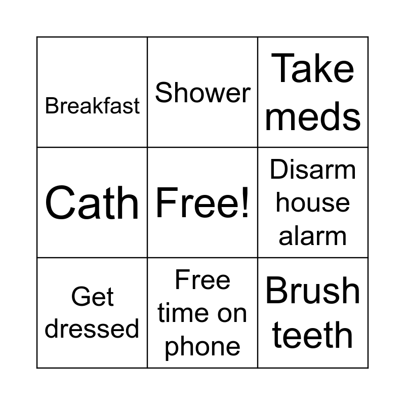 This bingo card has a free space and 8 words: Disarm house alarm, Take meds, Shower, Get dressed, Breakfast, Brush teeth, Cath and Free time on phone.