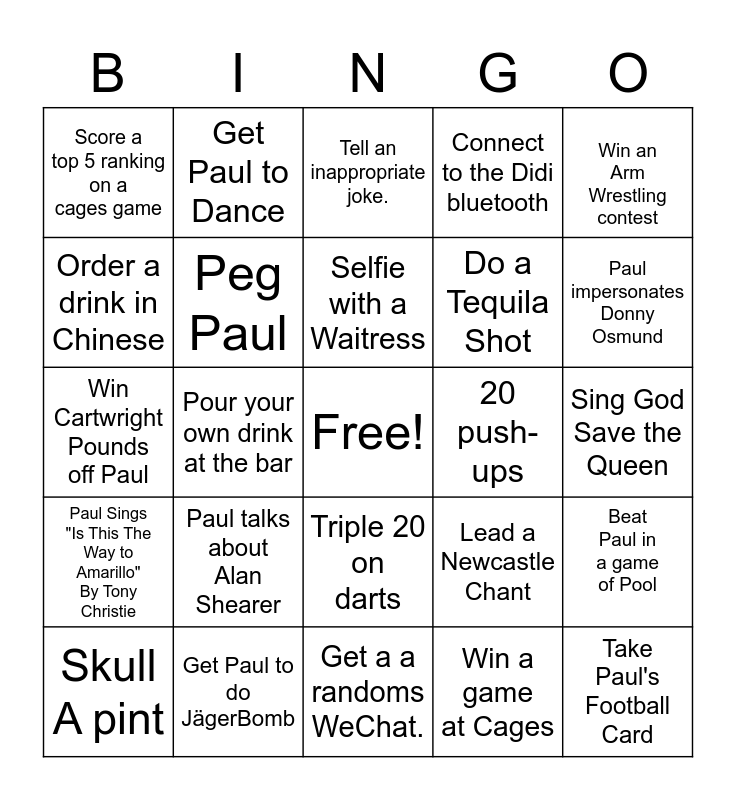 This bingo card has a free space and 24 words: Paul talks about Alan Shearer, Get Paul to do JägerBomb, Selfie with a Waitress, Skull A pint, Win an Arm Wrestling contest, Score a top 5 ranking on a cages game, Order a drink in Chinese, Get Paul to Dance, 20 push-ups, Triple 20 on darts, Do a Tequila Shot, Win Cartwright Pounds off Paul, Lead a Newcastle Chant, Beat Paul in a game of Pool, Peg Paul, Win a game at Cages, Sing God Save the Queen, Tell an inappropriate joke., Paul impersonates Donny Osmund, Pour your own drink at the bar, Take Paul's Football Card, Paul Sings "Is This The Way to Amarillo" By Tony Christie, Connect to the Didi bluetooth and Get a a randoms WeChat..