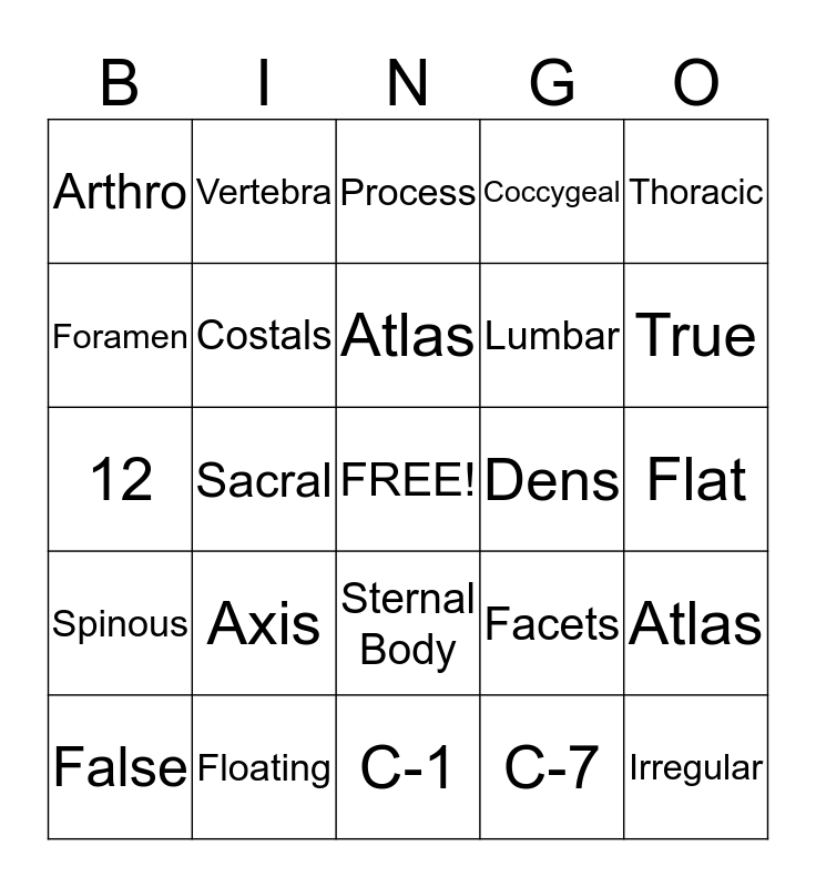This bingo card has a free space and 38 words: Manubrial Notch, Manubrium, Xiphoid Process, Costals, Atlas, Axis, Atlas, Cervical, Thoracic, Lumbar, Sacral, Coccygeal, Irregular, Flat, Foramen, Spinous, Transverse, Process, Lamina Groove, Dens, Arthro, Floating, True, False, 7, C-1, C-2, Lordotic, Kyphotic, Sacroiliac, Sternocostal Costochondral Intervertebral, Sternal Body, C-7, Vertebra, Tubercle, Facets, 12 and Ventral.