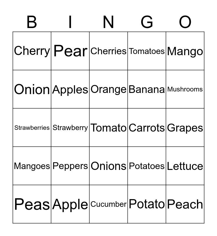 This bingo card has a free space and 24 words: Peppers, Apple, Orange, Peas, Mango, Cherry, Onion, Pear, Carrots, Onions, Banana, Strawberries, Potatoes, Lettuce, Apples, Potato, Grapes, Cherries, Mushrooms, Strawberry, Peach, Mangoes, Tomatoes and Cucumber.