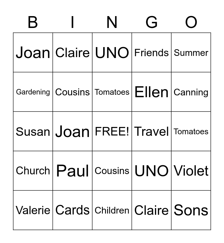 ⚠ This card has duplicate items: Canning (2), Cards (2), Children (2), Church (2), Claire (2), Cooking (2), Cousins (2), Daughters (2), Ellen (2), Family (2), Friends (2), Gardening (2), Glenn (2), Joan (2), Sons (2), Summer (2), Susan (2), Tomatoes (2), Travel (2), UNO (2), Valerie (2), Violet (2), Virginia (2)