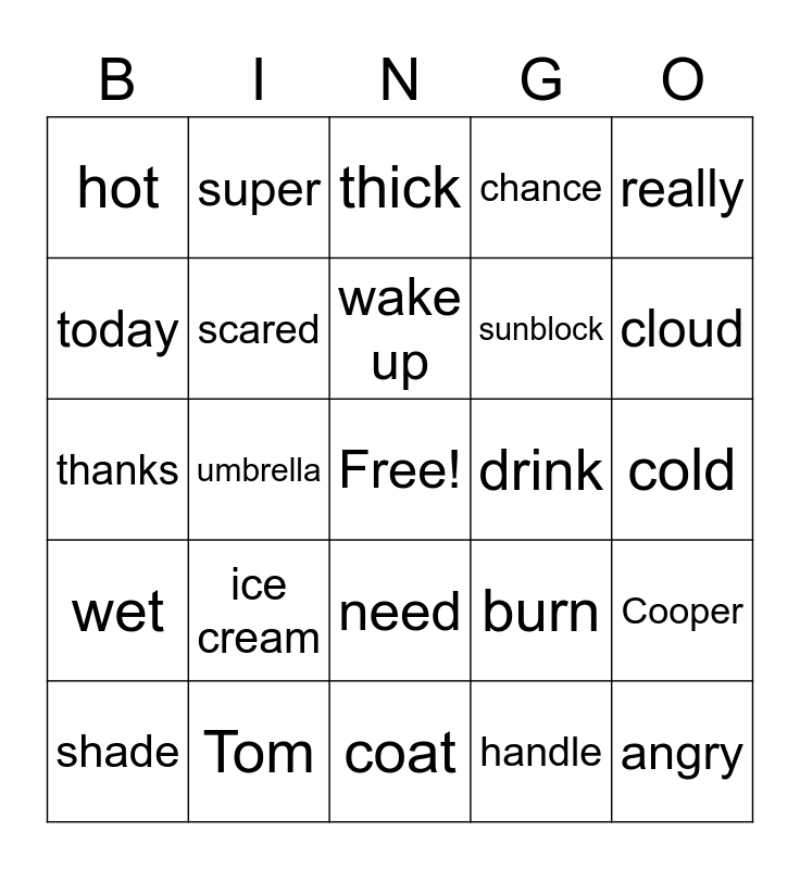 This bingo card has a free space and 24 words: ice cream, Tom, wake up, shade, really, hot, today, super, drink, need, sunblock, thanks, burn, Cooper, scared, handle, cold, thick, cloud, umbrella, angry, wet, chance and coat.