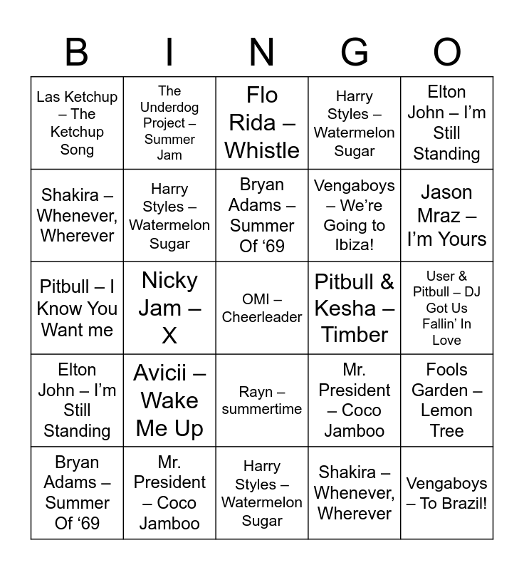 ⚠ This card has duplicate items: User & Pitbull – DJ Got Us Fallin’ In Love (8), OMI – Cheerleader (8), Harry Styles – Watermelon Sugar (8), Mobombi – Bumpy Ride (8), Elton John – I’m Still Standing (8), Safri Duo – Played-A-Live (8), TOTO – Africa (8), Shakira – Whenever, Wherever (8), Flo Rida & Sia – Wild Ones (8), Lou Bega – Mambo No.5 (8), Avicii – Wake Me Up (8), Las Ketchup – The Ketchup Song (8), Acda en de Munnik – Het Regent Zonnestralen (8), Fools Garden – Lemon Tree (8), Vengaboys- Hot Hot Ho (8), Mike Posner – I Took A Pill In Ibiza (8), Calvin Harris – Summer (8), Rayn – summertime (8), Nicky Jam – X (8), The Underdog Project – Summer Jam (8), Wildstylez – Year of Summer (8), Mr. President – Coco Jamboo (8), Axwell /\ Ingrosso – Sun is Shining (8), Flo Rida – Whistle (8), Pitbull & Kesha – Timber (8), Sam Feldt – Post Malone (8), Vengaboys – To Brazil! (8), Shakira – Hips Don’t Lie (8), Pitbull – I Know You Want me (8), Luis Fonsi & Daddy Yankee – Despacito (8), Shakira – Waka Waka (8), Katy Perry & Snoop Dogg – California Gurls (8), Jason Mraz – I’m Yours (8), Bryan Adams – Summer Of ‘69 (8), Vengaboys – We’re Going to Ibiza! (8)
