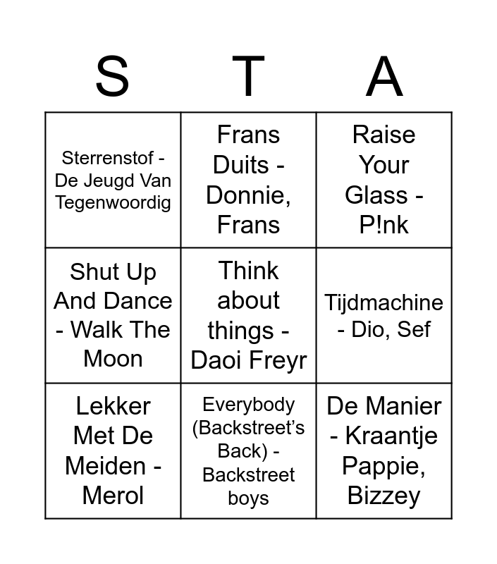 This bingo card has 25 words: Free!, Mamma Mia - ABBA, Everybody (Backstreet’s Back) - Backstreet boys, I Gotta Feeling - Black Eyed Peas, Think about things - Daoi Freyr, Sterrenstof - De Jeugd Van Tegenwoordig, Tijdmachine - Dio, Sef, Frans Duits - Donnie, Frans, We’re All In This Together - High School Musical Cast, Meidengroep - Kinderen voor Kinderen, De Manier - Kraantje Pappie, Bizzey, Just Dance - Lady Gaga, The Ketchup Song - Las Ketchup, Can’t Hold Us - Macklemore & Ryan Lewis, Lekker Met De Meiden - Merol, Bumpy Ride - Mohombi, Blijf je Vanavond - Monique Smit, Raise Your Glass - P!nk, Don’t Stop Me Now - Queen, Hips Don’t Lie - Shakira, Wyclef Jean, Hangover - Taio Cruz, Flo Rida, Stupid - Tess, Dromendans - Vinzzent, Shut Up And Dance - Walk The Moon and It’s Raining Men - The Weather Girls.