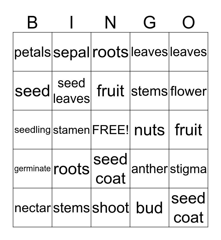 This bingo card has a free space and 25 words: roots, shoot, fruit, nectar, leaves, petals, seed, sepal, nuts, seed coat, stems, seedling, anther, stigma, seed leaves, pollen, fruit, roots, flower, stamen, seed coat, stems, germinate, leaves and bud.
