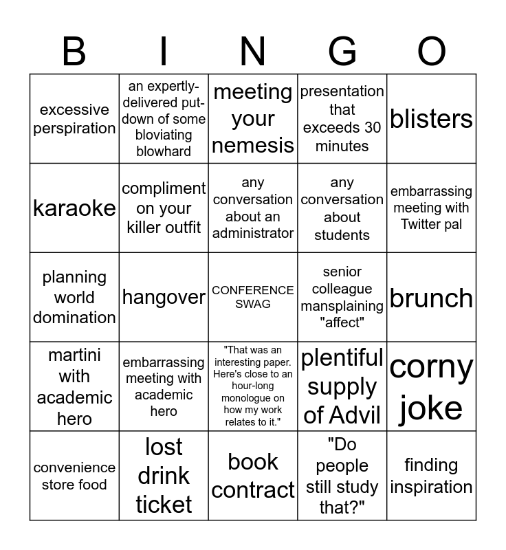 This bingo card has a free space and 24 words: embarrassing meeting with academic hero, lost drink ticket, any conversation about an administrator, convenience store food, blisters, excessive perspiration, karaoke, an expertly-delivered put-down of some bloviating blowhard, senior colleague mansplaining "affect", "That was an interesting paper. Here's close to an hour-long monologue on how my work relates to it.", any conversation about students, planning world domination, plentiful supply of Advil, corny joke, compliment on your killer outfit, "Do people still study that?", brunch, meeting your nemesis, embarrassing meeting with Twitter pal, hangover, finding inspiration, martini with academic hero, presentation that exceeds 30 minutes and book contract.