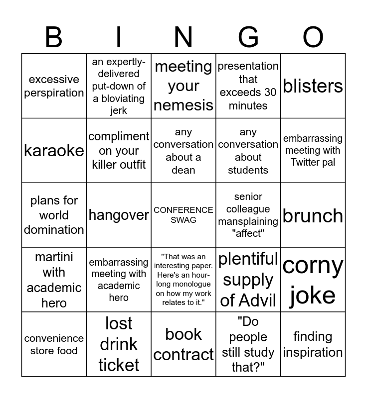 This bingo card has a free space and 24 words: embarrassing meeting with academic hero, lost drink ticket, any conversation about a dean, convenience store food, blisters, excessive perspiration, karaoke, an expertly-delivered put-down of a bloviating jerk, senior colleague mansplaining "affect", "That was an interesting paper. Here's an hour-long monologue on how my work relates to it.", any conversation about students, plans for world domination, plentiful supply of Advil, corny joke, compliment on your killer outfit, "Do people still study that?", brunch, meeting your nemesis, embarrassing meeting with Twitter pal, hangover, finding inspiration, martini with academic hero, presentation that exceeds 30 minutes and book contract.