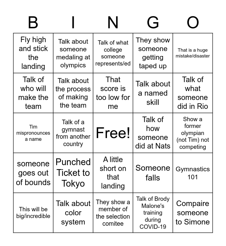 This bingo card has a free space and 24 words: Punched Ticket to Tokyo, Talk about color system, That score is too low for me, This will be big/incredible, That is a huge mistake/disaster, Fly high and stick the landing, Talk of who will make the team, Talk about someone medaling at olympics, Talk of how someone did at Nats, A little short on that landing, Talk about a named skill, Tim mispronounces a name, Someone falls, Gymnastics 101, Talk about the process of making the team, Talk of Brody Malone's training during COVID-19, Show a former olympian (not Tim) not competing, Talk of what college someone represents/ed, Talk of what someone did in Rio, Talk of a gymnast from another country, Compaire someone to Simone, someone goes out of bounds, They show someone getting taped up and They show a member of the selection comitee.
