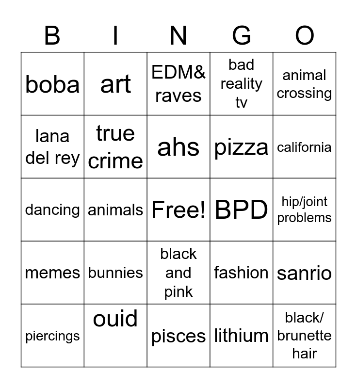 This bingo card has a free space and 24 words: bunnies, ouid, ahs, piercings, animal crossing, boba, lana del rey, art, BPD, black and pink, pizza, dancing, fashion, sanrio, true crime, lithium, hip/joint problems, EDM& raves, california, animals, black/ brunette hair, memes, bad reality tv and pisces.