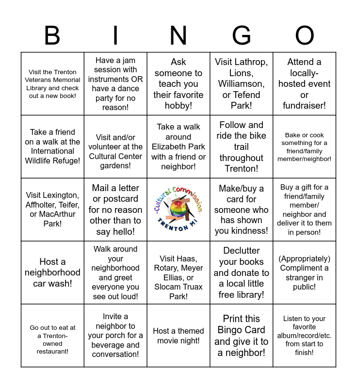 This bingo card has a free space and 24 words: Walk around your neighborhood and greet everyone you see out loud!, Invite a neighbor to your porch for a beverage and conversation!, Take a walk around Elizabeth Park with a friend or neighbor!, Go out to eat at a Trenton-owned restaurant!, Attend a locally-hosted event or fundraiser!, Visit the Trenton Veterans Memorial Library and check out a new book!, Take a friend on a walk at the International Wildlife Refuge!, Have a jam session with instruments OR have a dance party for no reason!, Make/buy a card for someone who has shown you kindness!, Visit Haas, Rotary, Meyer Ellias, or Slocam Truax Park!, Follow and ride the bike trail throughout Trenton!, Visit Lexington, Affholter, Teifer, or MacArthur Park!, Declutter your books and donate to a local little free library!, (Appropriately) Compliment a stranger in public!, Visit and/or volunteer at the Cultural Center gardens!, Print this Bingo Card and give it to a neighbor!, Buy a gift for a friend/family member/ neighbor and deliver it to them in person!, Ask someone to teach you their favorite hobby!, Bake or cook something for a friend/family member/neighbor!, Mail a letter or postcard for no reason other than to say hello!, Listen to your favorite album/record/etc. from start to finish!, Host a neighborhood car wash!, Visit Lathrop, Lions, Williamson, or Tefend Park! and Host a themed movie night!.