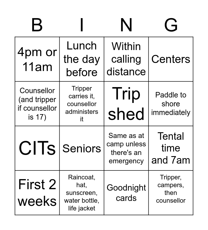 This bingo card has 16 words: Raincoat, hat, sunscreen, water bottle, life jacket, Tental time and 7am, Within calling distance, 4pm or 11am, CITs, Lunch the day before, Same as at camp unless there's an emergency, Goodnight cards, Counsellor (and tripper if counsellor is 17), Tripper carries it, counsellor administers it, First 2 weeks, Centers, Seniors, Paddle to shore immediately, Trip shed and Tripper, campers, then counsellor.