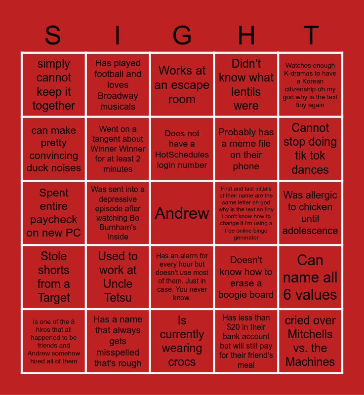 This bingo card has a free space and 29 words: Is one of the 8 hires that all happened to be friends and Andrew somehow hired all of them, Can't eat Lentils, Was sent into a depressive episode after watching Bo Burnham's Inside, Got yelled at a lot during school for talking too much, simply cannot keep it together, Works at an escape room, Went on a tangent about Winner Winner for at least 2 minutes, Used to work at Uncle Tetsu, First and last initials of their name are the same letter oh god why is the text so tiny i don't know how to change it i'm using a free online bingo generator, Has a name that always gets misspelled that's rough, Was allergic to chicken until adolescence, cried over Mitchells vs. the Machines, Is currently wearing crocs, Has less than $20 in their bank account but will still pay for their friend's meal, Cannot stop doing tik tok dances, Has a photography insta but has it privated, Has an alarm for every hour but doesn't use most of them. Just in case. You never know., Stole shorts from a Target, Watches enough K-dramas to have a Korean citizenship oh my god why is the text tiny again, Spent entire paycheck on new PC, Doesn't know how to erase a boogie board, Doesn't like icebreakers >:(, Probably has a meme file on their phone, can make pretty convincing duck noises, Didn't know what lentils were, Has played football and loves Broadway musicals, Can name all 6 values, Does not have a HotSchedules login number and Has at least 1 ticket.