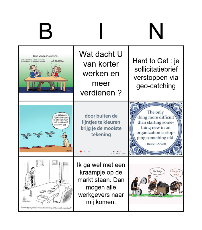 This bingo card has 8 images, a free space and 7 words: Innovatie : de touwtjes in handen nemen, de eindjes aan mekaar knopen en knopen doorhakken., Hard to Get : je sollicitatiebrief verstoppen via geo-catching, Ik ga wel met een kraampje op de markt staan. Dan mogen alle werkgevers naar mij komen., Ach, de arbeidsmarkt. Daar wil je toch niet werken !, Alles verandert, en dat zal altijd wel zo blijven !, Wat dacht U van korter werken en meer verdienen ? and Teambuilding : samen een to-do-lijstje maken voor de baas.