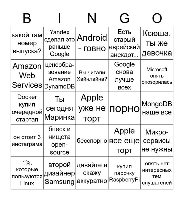 This bingo card has a free space and 24 words: блеск и нищета open-source, второй дизайнер Samsung, Вы читали Хайнлайна?, 1%, которые пользуются Linux, Ксюша, ты же девочка, какой там номер выпуска?, Amazon Web Services, Yandex сделал это раньше Google, порно, бесспорно, Google снова лучше всех, Docker купил очередной стартап, Apple все еще торт, Микро-сервисы не нужны, ценообра-зование Amazon DynamoDB, купил парочку RaspberryPi, MongoDB наше все, Android - говно, Microsoft опять опозорилась, Ты сегодня Маринка, опять нет интересных тем слушателей, он стоит 3 инстаграма, Есть старый еврейский анекдот... and давайте я скажу аккуратно.