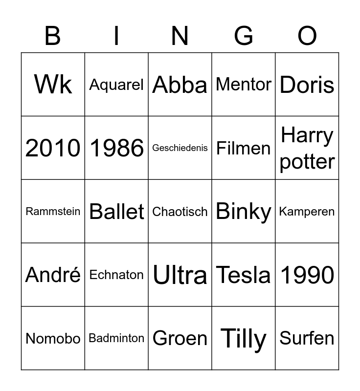 This bingo card has 41 words: Free!, Rammstein, Grijs, 1986, Badminton, Ultra, Geschiedenis, Tamama, Doris, André, Ballet, Mentor, Chaotisch, Kamperen, Binky, Echnaton, Zorgzaam, Wk, Mysterieus, Abba, 1990, Surfen, Groen, Filmen, Kunst, Annet, Tilly, Golf, Harry potter, Technisch, Kabels, Aquarel, Nomobo, Bordspelletjes, Tesla, 2010, Televisie, Onderwijs, 11 Jaar, Zwanger and Emmeloord.