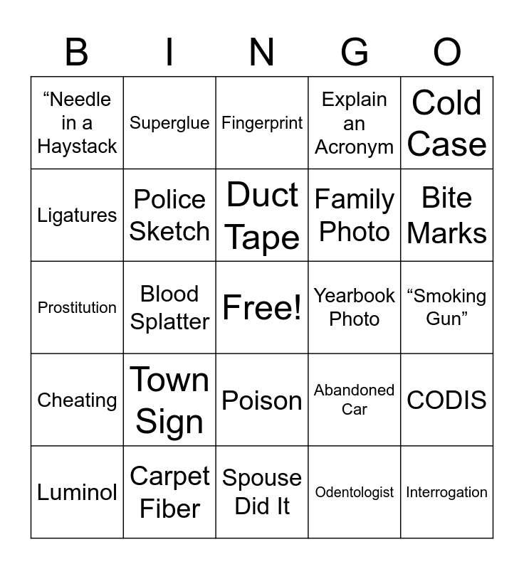 This bingo card has a free space and 29 words: Luminol, DNA match, Blood Splatter, Stripclub Footage, “Needle in a Haystack, Fingerprint, Police Sketch, Town Sign, Yearbook Photo, Carpet Fiber, “Smoking Gun”, Interrogation, Spouse Did It, Odentologist, Bite Marks, Shoe/Footprints, Poison, Cheating, Cold Case, Prostitution, Abandoned Car, Wedding Photo, Family Photo, Ligatures, Explain an Acronym, Superglue, CODIS, Duct Tape and FBI.