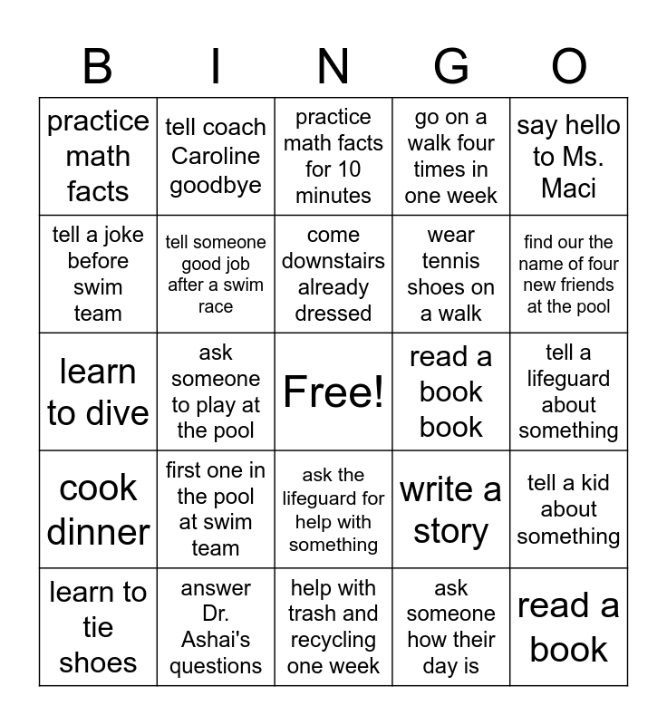 This bingo card has a free space and 24 words: first one in the pool at swim team, answer Dr. Ashai's questions, come downstairs already dressed, learn to tie shoes, say hello to Ms. Maci, practice math facts, tell a joke before swim team, tell coach Caroline goodbye, read a book book, ask the lifeguard for help with something, wear tennis shoes on a walk, learn to dive, write a story, tell a kid about something, tell someone good job after a swim race, ask someone how their day is, tell a lifeguard about something, practice math facts for 10 minutes, find our the name of four new friends at the pool, ask someone to play at the pool, read a book, cook dinner, go on a walk four times in one week and help with trash and recycling one week.
