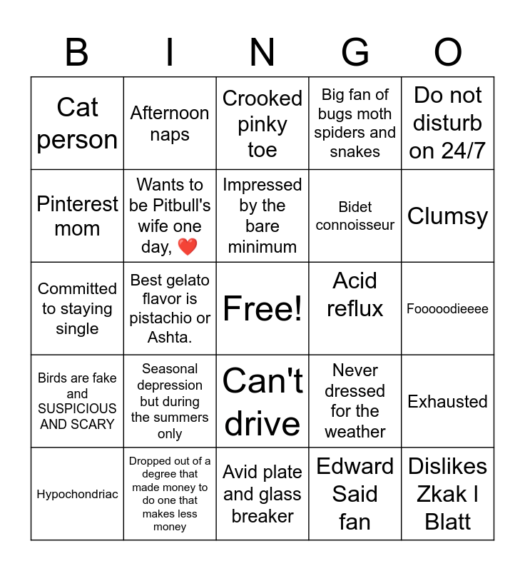 This bingo card has a free space and 24 words: Seasonal depression but during the summers only, Dropped out of a degree that made money to do one that makes less money, Impressed by the bare minimum, Hypochondriac, Do not disturb on 24/7, Cat person, Pinterest mom, Afternoon naps, Acid reflux, Can't drive, Bidet connoisseur, Committed to staying single, Never dressed for the weather, Exhausted, Wants to be Pitbull's wife one day, ❤️, Edward Said fan, Fooooodieeee, Crooked pinky toe, Clumsy, Best gelato flavor is pistachio or Ashta., Dislikes Zkak l Blatt, Birds are fake and SUSPICIOUS AND SCARY, Big fan of bugs moth spiders and snakes and Avid plate and glass breaker.