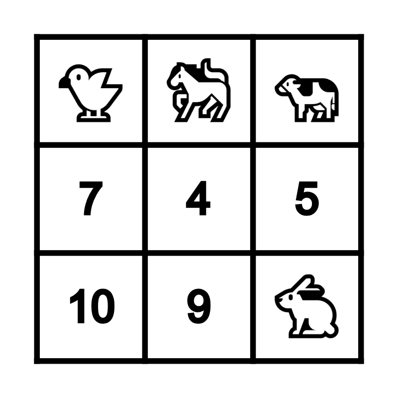 This bingo card has 6 images and 10 words: 2, 3, 4, 5, 6, 7, 8, 9, 10 and 1.