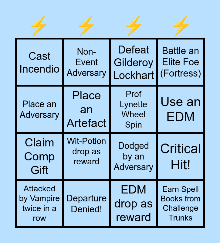 This bingo card has 16 words: Departure Denied!, Critical Hit!, Defeat Gilderoy Lockhart, Cast Incendio, Claim Comp Gift, Non-Event Adversary, Dodged by an Adversary, EDM drop as reward, Place an Adversary, Place an Artefact, Attacked by Vampire twice in a row, Battle an Elite Foe (Fortress), Wit-Potion drop as reward, Use an EDM, Prof Lynette Wheel Spin and Earn Spell Books from Challenge Trunks.