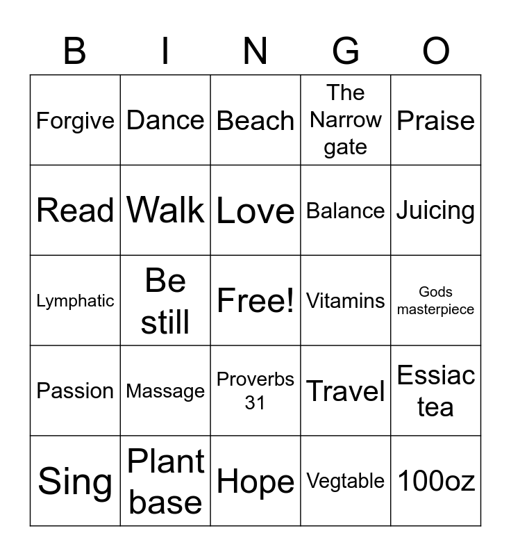 This bingo card has a free space and 34 words: Detox, Vegtable, H2o, Antistress, Passion, Walk, Praise, Sing, Dance, Laugh, Love, Beach, Hobby, Coffee enema, Vitamins, Juicing, Plant base, Lymphatic, Massage, Travel, Proverbs 31, Get well, Forgive, Gods masterpiece, Hope, 100oz, The Narrow gate, Friends, Balance, Read, Entrepreneur, Be still, Essiac tea and Hyper nourish.