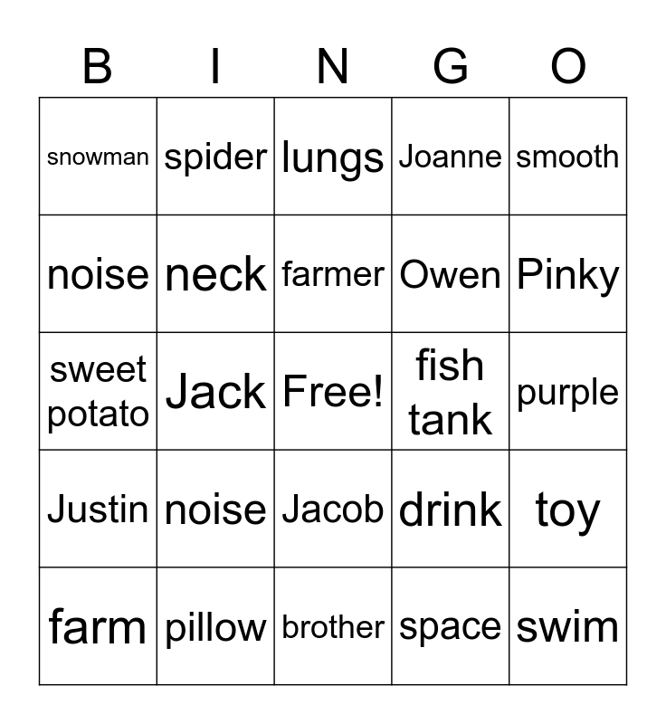 This bingo card has a free space and 24 words: farm, noise, farmer, space, smooth, snowman, spider, lungs, fish tank, purple, sweet potato, neck, drink, toy, noise, pillow, brother, Joanne, Pinky, Justin, Jack, Jacob, Owen and swim.