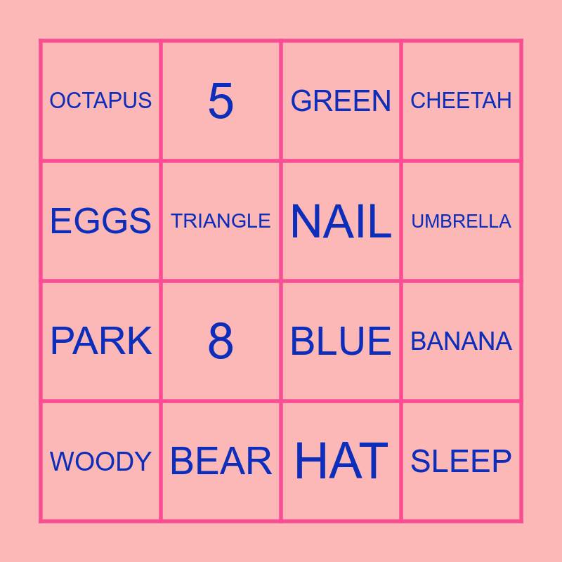 This bingo card has 16 words: BEAR, BANANA, GREEN, OCTAPUS, PARK, 5, BLUE, HAT, EGGS, TRIANGLE, WOODY, CHEETAH, 8, UMBRELLA, NAIL and SLEEP.