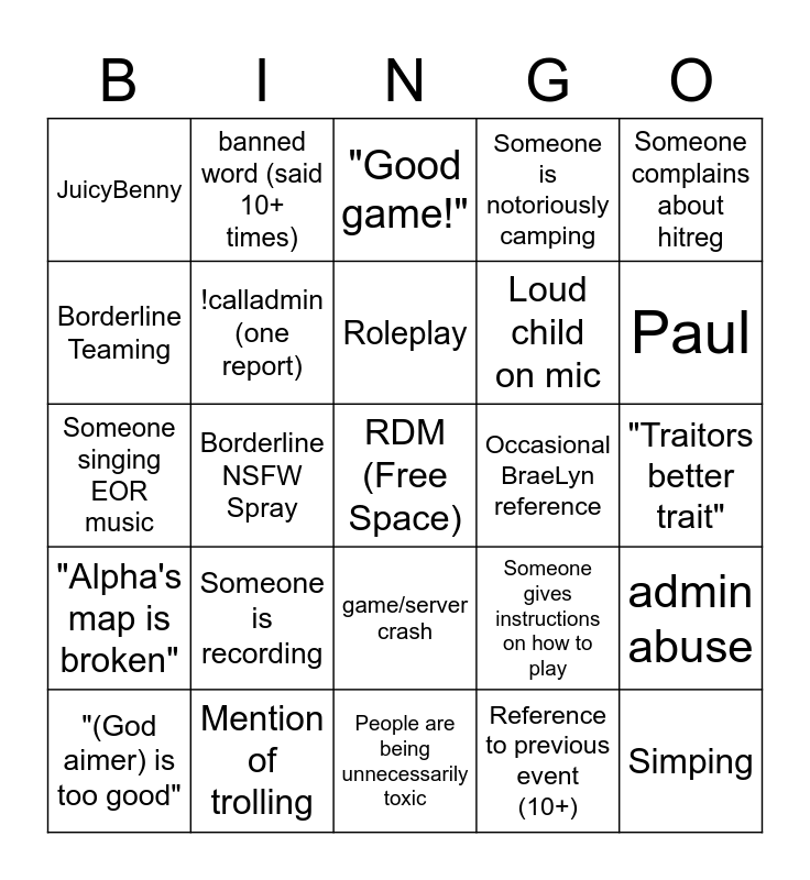 This bingo card has a free space and 24 words: Someone is recording, Mention of trolling, Roleplay, "(God aimer) is too good", Someone complains about hitreg, JuicyBenny, Borderline Teaming, banned word (said 10+ times), Occasional BraeLyn reference, game/server crash, Loud child on mic, Someone singing EOR music, Someone gives instructions on how to play, admin abuse, !calladmin (one report), Reference to previous event (10+), "Traitors better trait", "Good game!", Paul, Borderline NSFW Spray, Simping, "Alpha's map is broken", Someone is notoriously camping and People are being unnecessarily toxic.