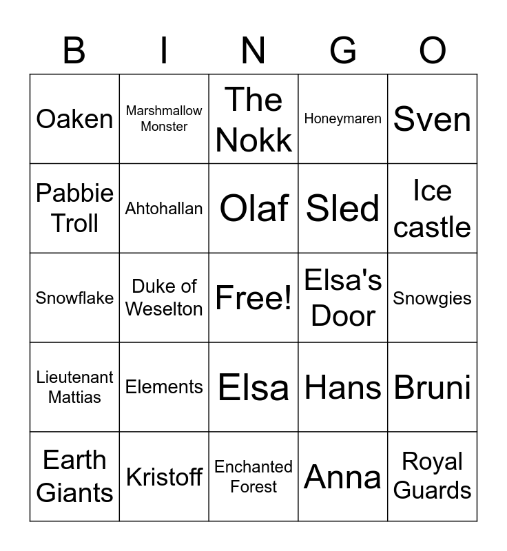 This bingo card has a free space and 26 words: Elsa, Anna, Olaf, Kristoff, Sven, Oaken, Pabbie Troll, Marshmallow Monster, Snowgies, Hans, Sled, Snowflake, Bruni, Earth Giants, Duke of Weselton, Gale, Honeymaren, Lieutenant Mattias, The Nokk, Royal Guards, Ice castle, Enchanted Forest, Elsa's Door, Elements, Ahtohallan and TH.