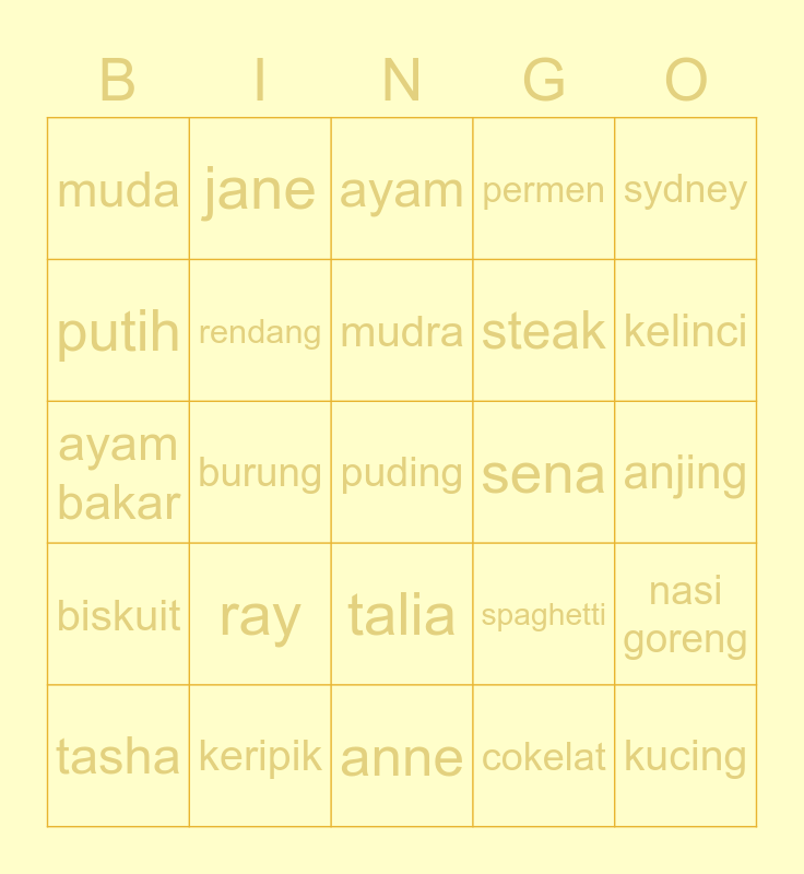 This bingo card has 25 words: ray, anne, mudra, tasha, sydney, muda, putih, jane, sena, talia, steak, ayam bakar, spaghetti, nasi goreng, rendang, kucing, anjing, ayam, kelinci, burung, puding, keripik, biskuit, permen and cokelat.