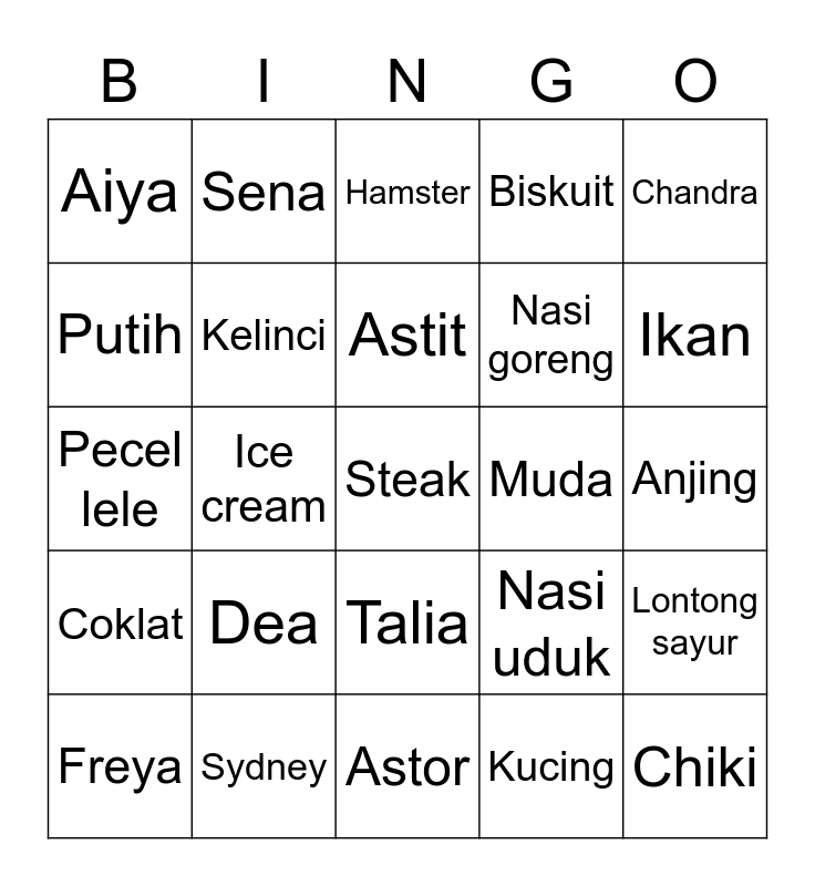 This bingo card has a free space and 24 words: Dea, Sydney, Astit, Freya, Chandra, Aiya, Putih, Sena, Muda, Talia, Nasi goreng, Pecel lele, Nasi uduk, Lontong sayur, Kelinci, Kucing, Anjing, Hamster, Ikan, Ice cream, Chiki, Coklat, Biskuit and Astor.