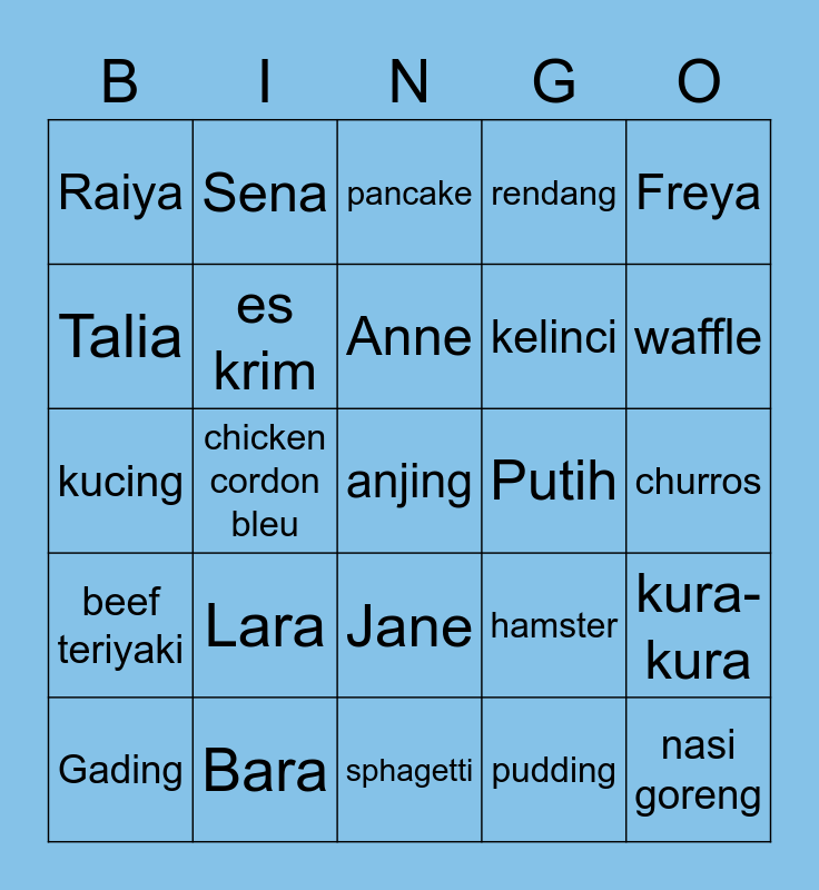 This bingo card has a free space and 24 words: Lara, Bara, Anne, Gading, Freya, Raiya, Talia, Sena, Putih, Jane, kelinci, kucing, hamster, kura-kura, es krim, pudding, churros, pancake, waffle, chicken cordon bleu, nasi goreng, beef teriyaki, rendang and sphagetti.