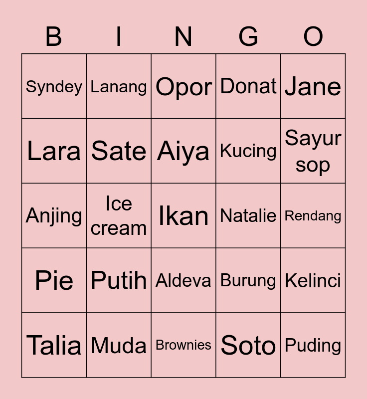 This bingo card has a free space and 24 words: Putih, Muda, Aiya, Talia, Jane, Syndey, Lara, Lanang, Natalie, Aldeva, Kucing, Anjing, Burung, Kelinci, Sate, Soto, Rendang, Opor, Sayur sop, Ice cream, Puding, Pie, Donat and Brownies.