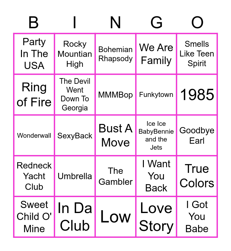This bingo card has 58 words: Total Eclipse of the Heart, In Da Club, Drop It Like It's Hot, Redneck Yacht Club, Love Story, Red High Heels, The Devil Went Down To Georgia, Tainted Love, Funkytown, Walk Like An Egyptian, We Are Family, Wake Me Up Before You Go-Go, Don't You, A Little Less Conversation, Before He Cheats, Party In The USA, Bust A Move, Smells Like Teen Spirit, Don't Speak, MMMBop, Ice Ice BabyBennie and the Jets, Bohemian Rhapsody, Sweet Child O' Mine, True Colors, Bad Romance, Goodbye Earl, I Want It That Way, Bye Bye Bye, 1985, Wannabe, I Go Back, ...Baby One More Time, Jolene, Since U Been Gone, Ironic, Just The Way You Are, Yeah!, SexyBack, Wonderwall, Don't Go Breaking My Heart, Umbrella, I Got You Babe, I Want You Back, No Scrubs, U Can't Touch This, Only Wanna Be With You, Lose Yourself, The Gambler, Low, Bootylicious, Hot in Here, Sk8ter Boi, Chicken Fried, Cruise, Rocky Mountian High, 9 to 5, Ring of Fire and Kiss Bad Moon Rising.