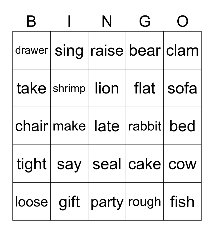 This bingo card has a free space and 24 words: say, gift, lion, loose, clam, drawer, take, sing, rabbit, seal, flat, chair, cake, cow, shrimp, rough, bed, raise, sofa, make, fish, tight, bear and party.