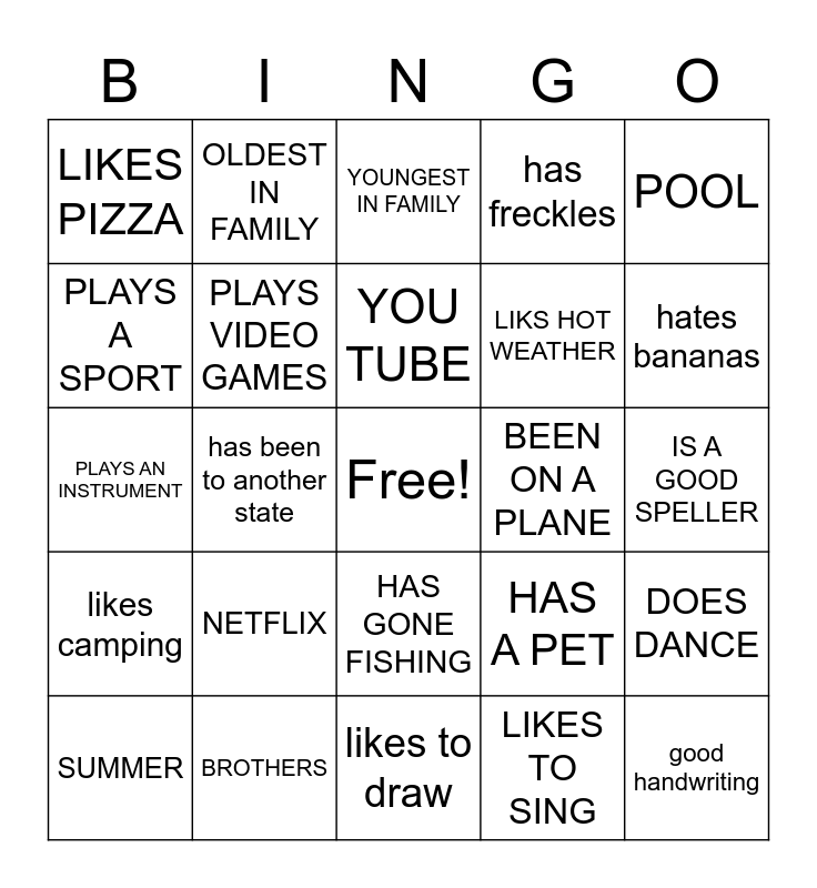 This bingo card has a free space and 24 words: NETFLIX, BROTHERS, YOU TUBE, SUMMER, POOL, LIKES PIZZA, PLAYS A SPORT, OLDEST IN FAMILY, BEEN ON A PLANE, HAS GONE FISHING, LIKS HOT WEATHER, PLAYS AN INSTRUMENT, HAS A PET, DOES DANCE, PLAYS VIDEO GAMES, LIKES TO SING, IS A GOOD SPELLER, YOUNGEST IN FAMILY, hates bananas, has been to another state, good handwriting, likes camping, has freckles and likes to draw.