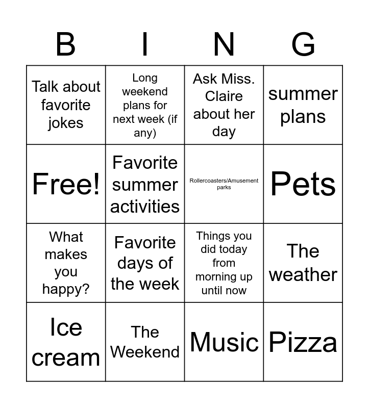 This bingo card has 16 words: The Weekend, The weather, Ask Miss. Claire about her day, Talk about favorite jokes, What makes you happy?, Long weekend plans for next week (if any), Things you did today from morning up until now, Music, Free!, Favorite summer activities, Ice cream, summer plans, Favorite days of the week, Pets, Rollercoasters/Amusement parks and Pizza.