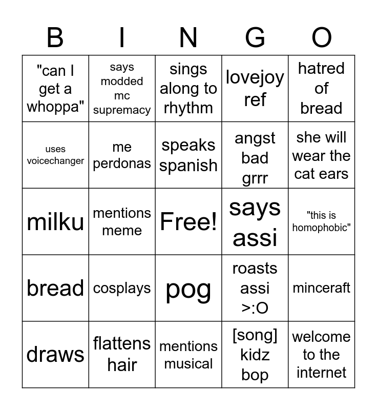 This bingo card has a free space and 24 words: cosplays, flattens hair, speaks spanish, draws, hatred of bread, "can I get a whoppa", uses voicechanger, says modded mc supremacy, says assi, pog, angst bad grrr, milku, roasts assi >:O, minceraft, me perdonas, [song] kidz bop, "this is homophobic", sings along to rhythm, she will wear the cat ears, mentions meme, welcome to the internet, bread, lovejoy ref and mentions musical.