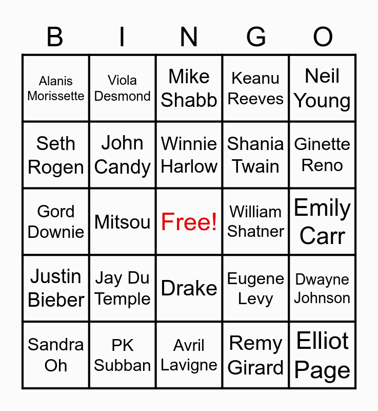 This bingo card has a free space and 54 words: Ryan Reynolds, Justin Bieber, Celine Dion, Mike Myers, Drake, Jim Carrey, Keanu Reeves, Keshia Chante, Seth Rogen, Dan Aykroyd, Alanis Morissette, The Weeknd, PK Subban, Sandra Oh, Yanic Truesdale, Avril Lavigne, Elliot Page, Shania Twain, Mary Shadd Cary, Emily Carr, Eugene Levy, Alex Trebek, William Shatner, Neil Young, Alphonso Davies, Viola Desmond, Ryan Gosling, Jay Baruchel, Carey Price, Remy Girard, Gerry Dee, Cabbie Richards, David Suzuki, Marc-Andre Grondin, Mike Shabb, Wayne Gretzky, Gord Downie, Dwayne Johnson, Laura Secord, John Candy, Lester B. Pearson, Jordin Tootoo, Pierre-Yves Lord, Patrick Chan, Jay Du Temple, Russell Peters, Terry Fox, Pierre Trudeau, Winnie Harlow, Mitsou, Ginette Reno, Tessa Virtue, Martin Matte and Leonard Cohen.
