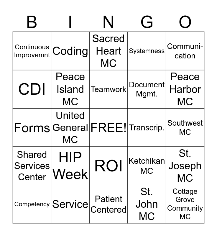 This bingo card has a free space and 24 words: HIP Week, Service, Teamwork, Competency, Communi-cation, Continuous Improvemnt, CDI, Coding, Transcrip., ROI, Document Mgmt., Forms, Ketchikan MC, St. Joseph MC, Peace Island MC, St. John MC, Southwest MC, Sacred Heart MC, Peace Harbor MC, United General MC, Cottage Grove Community MC, Shared Services Center, Systemness and Patient Centered.