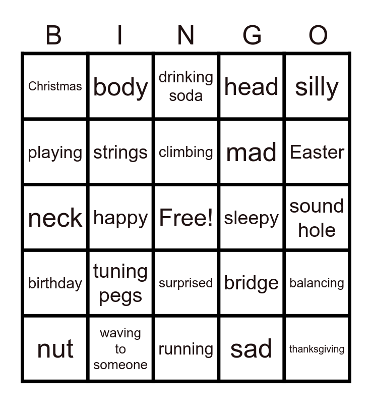 This bingo card has a free space and 24 words: tuning pegs, waving to someone, climbing, nut, silly, Christmas, playing, body, sleepy, surprised, mad, neck, bridge, balancing, strings, sad, sound hole, drinking soda, Easter, happy, thanksgiving, birthday, head and running.
