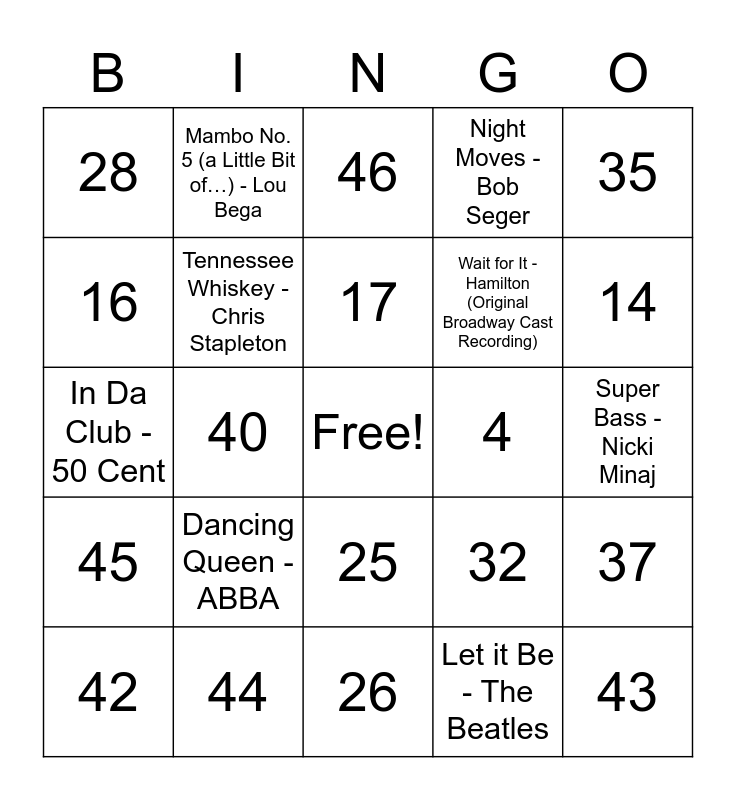 This bingo card has a free space and 96 words: 1, 2, 3, 4, 5, 6, 7, 8, 9, 10, 11, 12, 13, 14, 15, 16, 17, 18, 19, 20, 21, 22, 23, 24, 25, 26, 27, 28, 29, 30, 31, 32, 33, 34, 35, 36, 37, 38, 39, 40, 41, 42, 43, 44, 45, 46, 47, 48, Livin' la Vida Loca - Ricky Martin, I Wanna Dance with Somebody (Who Loves Me) - Whitney Houston, I Want It That Way - Backstreet Boys, 9 to 5 - Dolly Parton, Wake Me Up Before You Go-Go - Wham!, Africa - TOTO, Walking On Sunshine - Katrina & The Waves, All Star - Smash Mouth, Come On Eileen - Dexys Midnight Runners, …Baby One More Time - Britney Spears, Sweet Caroline - Neil Diamond, Genie In a Bottle - Christina Aguilera, Girls Just Want to Have Fun - Cyndi Lauper, Take on Me - a-ha, Hey Ya! - Outkast, MMMBop - Hanson, Stayin' Alive - Bee Gees, I'm So Excited - The Pointer Sisters, You make My Dreams (Come True) - Daryl Hall & John Oates, Karma Chameleon - Culture Club, Enter Sandman - Metallica, Let it Be - The Beatles, Kryptonite - 3 Doors Down, Never Gonna Give You Up - Rick Astley, Despacito - Luis Fonsi, Daddy Yankee, Justin Bieber, Friends in Low Places - Brooks Jefferson, Landslide - Fleetwood Mac, Johnny B. Goode - Chuck Berry, Nothings Going To Stop Us Now - Starship, Tennessee Whiskey - Chris Stapleton, Teenage Dream - Katy Perry, Wait for It - Hamilton (Original Broadway Cast Recording), Night Moves - Bob Seger, Take Me Home, Country Roads - John Denver, We Didn't Start The Fire - Billy Joel, September - Earth, Wind & Fire, Beyond - Leon Bridges, In Da Club - 50 Cent, Dancing Queen - ABBA, Call Me Maybe - Carly Rae Jepsen, Truth Hurts - Lizzo, Super Bass - Nicki Minaj, I Will Survive - Gloria Gaynor, American Pie - Don McLean, Sweet Home Alabama - Lynyrd Skynyrd, Livin' On A Prayer - Bon Jovi, Mambo No. 5 (a Little Bit of…) - Lou Bega and Kyrie - Mr. Mister.