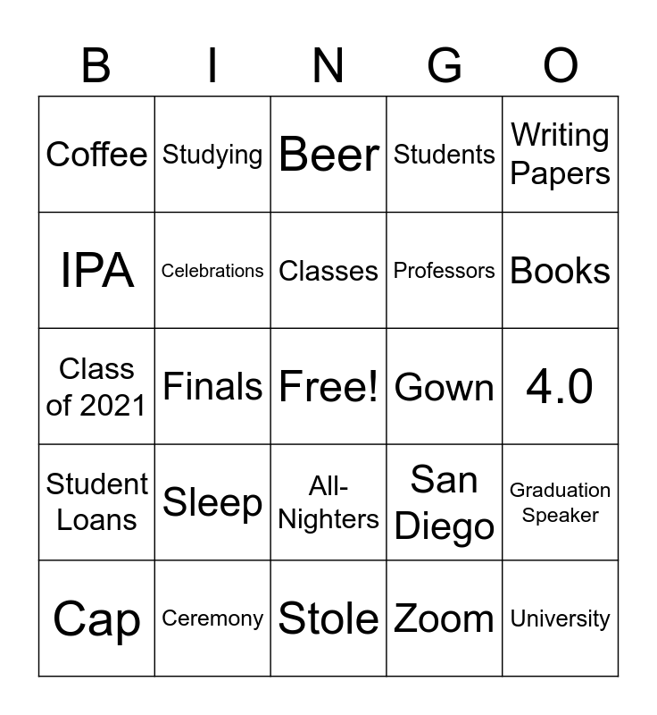 This bingo card has a free space and 29 words: Cap, Diploma, Finals, Masters Degree, Coffee, Beer, Celebrations, Sleep, Gown, Ceremony, 4.0, University, Stole, Zoom, Books, Library, All-Nighters, Student Loans, Writing Papers, Class of 2021, San Diego, D.C., Professors, IPA, Students, Studying, Graduation Speaker, Classes and Group Projects.