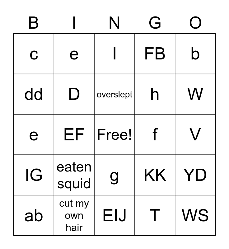 This bingo card has a free space and 24 words: eaten squid, cut my own hair, overslept, ab, b, c, dd, e, f, g, h, e, KK, YD, D, T, V, I, W, EF, WS, IG, FB and EIJ.