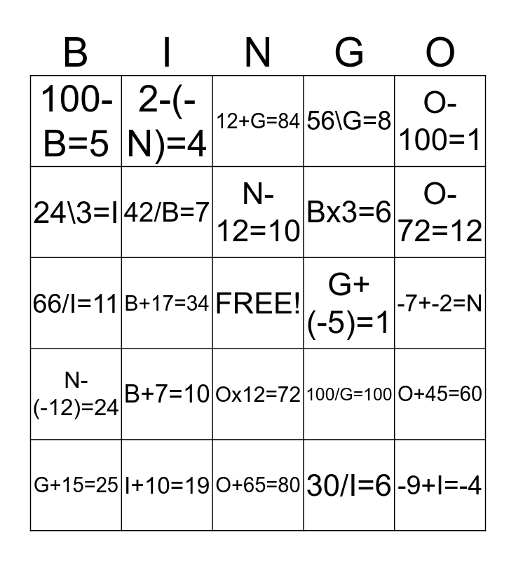 This bingo card has a free space and 24 words: B+7=10, I+10=19, N-12=10, G+15=25, O-100=1, 100-B=5, 24\3=I, 2-(-N)=4, G+(-5)=1, Ox12=72, Bx3=6, 66/I=11, 100/G=100, O+45=60, 42/B=7, 30/I=6, -7+-2=N, 12+G=84, O-72=12, B+17=34, -9+I=-4, N-(-12)=24, 56\G=8 and O+65=80.