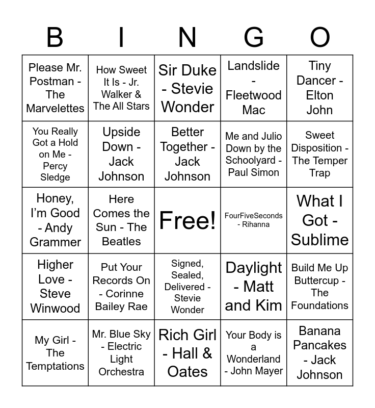This bingo card has a free space and 48 words: Tongue Tied - Grouplove, Banana Pancakes - Jack Johnson, Dreams - Fleetwood Mac, Rich Girl - Hall & Oates, Put Your Records On - Corinne Bailey Rae, Brandy - Looking Glass, How Sweet It Is - Jr. Walker & The All Stars, Lovely Day - Bill Withers, You Really Got a Hold on Me - Percy Sledge, Home - Edward Sharpe, Upside Down - Jack Johnson, Landslide - Fleetwood Mac, Build Me Up Buttercup - The Foundations, Daylight - Matt and Kim, Bennie and the Jets - Elton John, This Will Be - Natalie Cole, Better Together - Jack Johnson, FourFiveSeconds - Rihanna, Send Me On My Way - Rusted Root, Tiny Dancer - Elton John, Here Comes the Sun - The Beatles, Your Body is a Wonderland - John Mayer, Please Mr. Postman - The Marvelettes, Me and Julio Down by the Schoolyard - Paul Simon, I Can’t Help Myself - Four Tops, Sweet Disposition - The Temper Trap, My Girl - The Temptations, The Joker - Steve Miller Band, Signed, Sealed, Delivered - Stevie Wonder, Higher Love - Steve Winwood, I’ll Take You There - The Staple Singers, Easy - Commodores, She’s so High - Tal Bachman, Wonderful World, Beautiful People - Jimmy Cliff, Mr. Blue Sky - Electric Light Orchestra, Rockin’ Robin - Bobby Day, Love Train - The O’Jays, What I Got - Sublime, It’s Your Thing - The Isley Brothers, 1234 - Feist, Young Folks - Peter Bjorn and John, Semi-Charmed Life - Third Eye Blind, Sir Duke - Stevie Wonder, Mr. Brightside - The Killers, Honey, I’m Good - Andy Grammer, Stacy’s Mom - Fountains Of Wayne, You Can’t Hurry Love - The Supremes and Dancing Queen - ABBA.