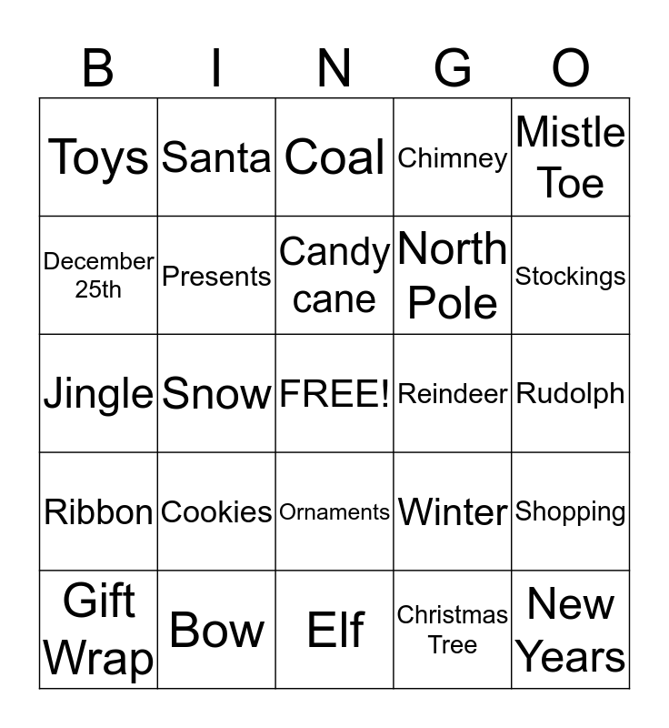 This bingo card has a free space and 24 words: Cookies, Bow, Candy cane, Gift Wrap, Mistle Toe, Toys, December 25th, Santa, Reindeer, Ornaments, North Pole, Jingle, Winter, Shopping, Presents, Christmas Tree, Rudolph, Coal, Stockings, Snow, New Years, Ribbon, Chimney and Elf.