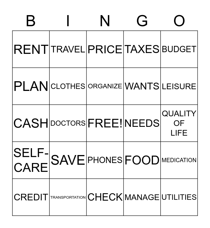 This bingo card has a free space and 24 words: SAVE, TRANSPORTATION, ORGANIZE, CREDIT, BUDGET, RENT, PLAN, TRAVEL, NEEDS, PHONES, WANTS, CASH, FOOD, MEDICATION, CLOTHES, MANAGE, QUALITY OF LIFE, PRICE, LEISURE, DOCTORS, UTILITIES, SELF-CARE, TAXES and CHECK.
